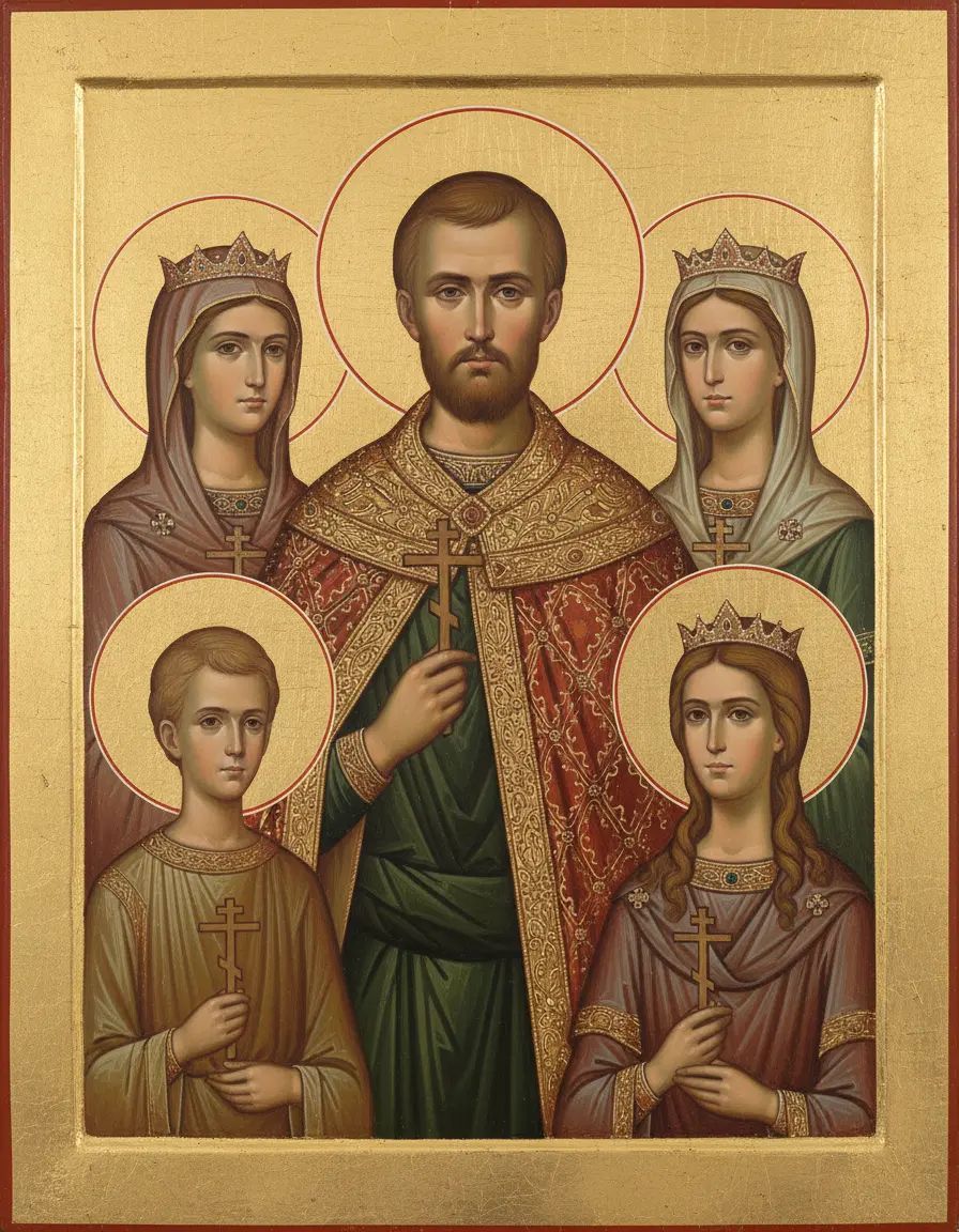 Индивидуальные образы — каждый член семьи может изображаться отдельно с нимбом, крестом и молитвенно сложенными руками.
