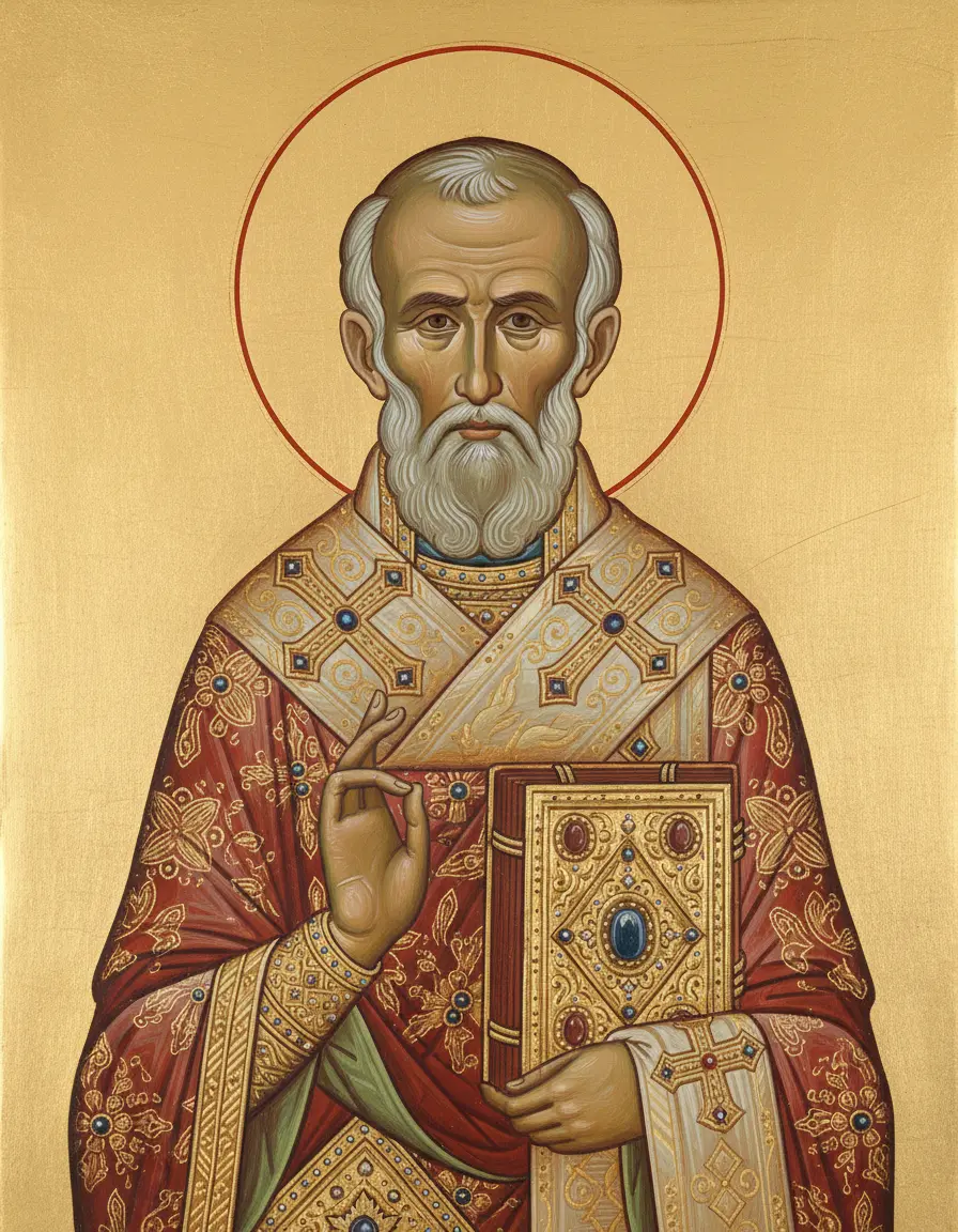- Облачение: обычно в золотой или белой ризе с крестами. В правой руке часто держит крест для благословения, в левой — Евангелие или свиток.