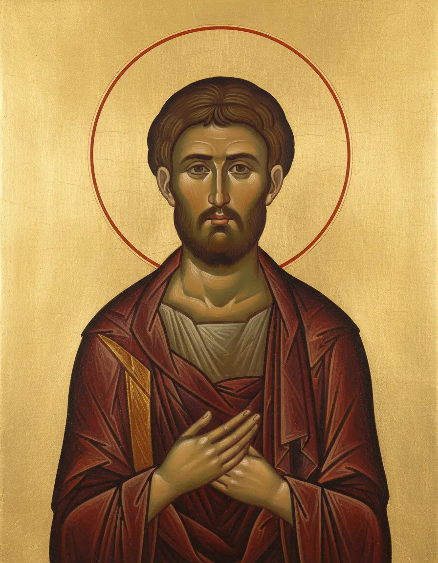 - В левой руке — может держать свиток с молитвой или Евангелие